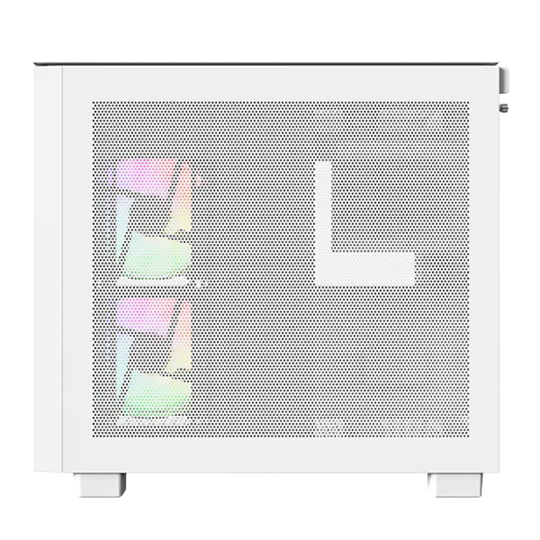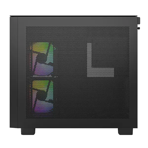 La facilidad de montaje es clave: cuenta con un mecanismo de liberación rápida sin herramientas para todos los paneles exteriores. La ventilación eficiente está garantizada por grandes áreas de malla en los paneles superior (60%) y lateral (75%), maximizando la circulación de aire. Incluye 3 ventiladores ARGB PWM preinstalados (2x 140mm laterales invertidos y 1x 120mm trasero) y soporta hasta 9 ventiladores en total.