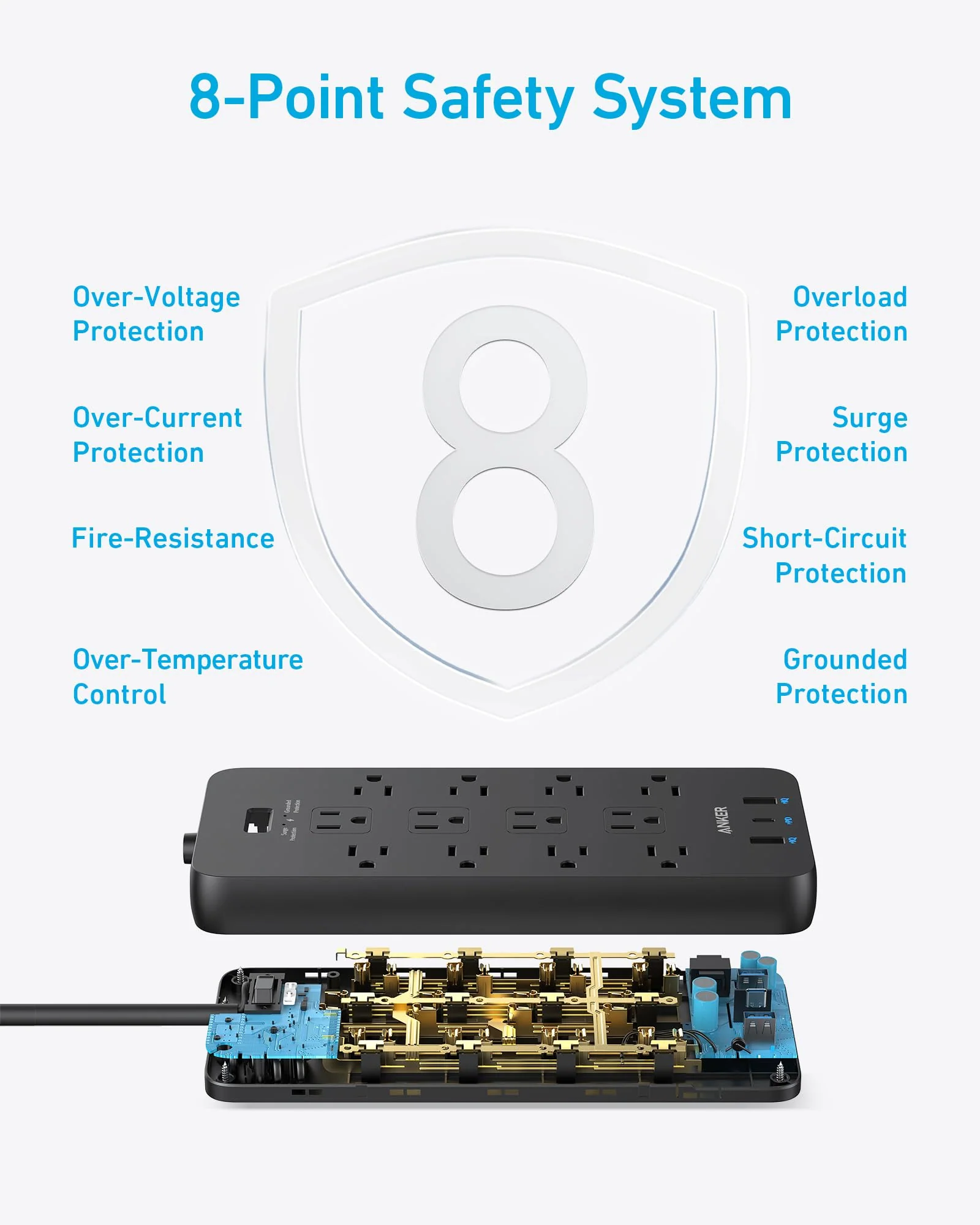 ¡Centraliza y protege la alimentación de todos tus dispositivos con la Regleta Supresora de Picos Anker 351! Esta estación de carga todo en uno es la solución definitiva para tu computadora y tus equipos electrónicos, ofreciendo una impresionante cantidad de tomas de corriente AC, puertos USB-C y USB-A, todo respaldado por un sistema de seguridad de 8 puntos. Es ideal para hogares modernos, oficinas y cualquier espacio que necesite una gestión de energía eficiente y segura.